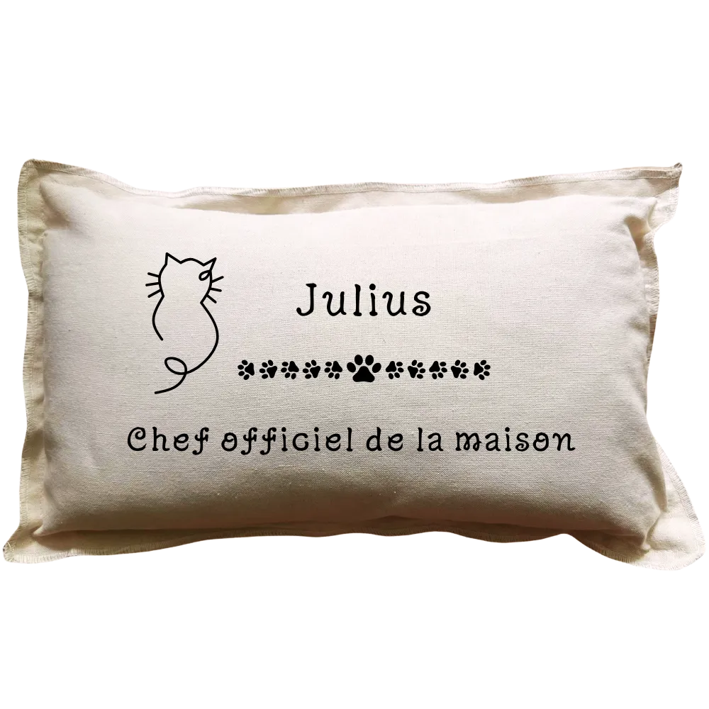 Coussin personnalisé chat "Chef officiel de la maison" en coton recyclé.