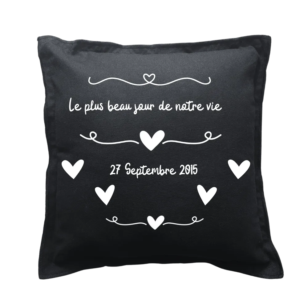 Coussin personnalisé mariage "Le plus beau jour de notre vie" en coton recyclé.