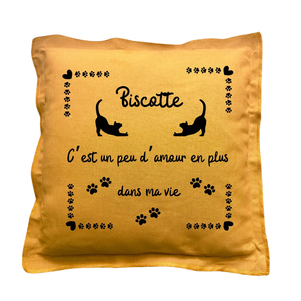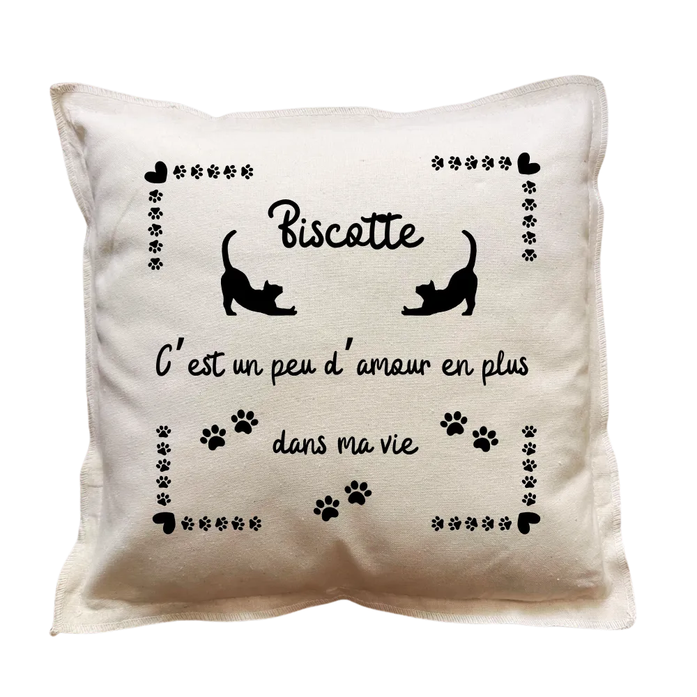 Coussin personnalisé chat "C'est un peu d'amour en plus" en coton recyclé.